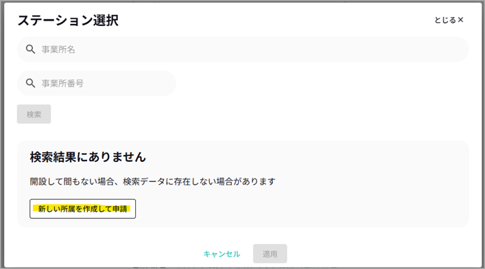 [事業所名]を入力後[検索]を押しても該当の「検索結果にありません」と表示される場合、新しい組織情報を登録して申請してください。